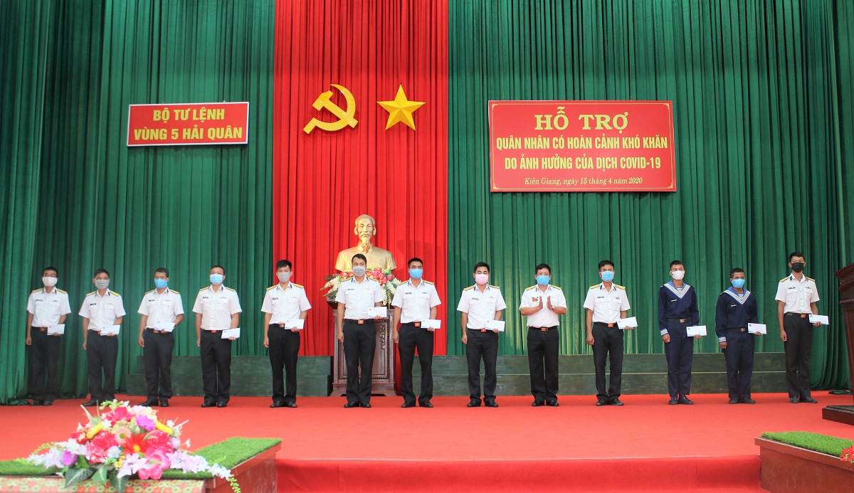 32 phần quà (mỗi phần quà trị giá 1 triệu đồng) đã được Vùng 5 Hải quân trao tặng các gia đình quân nhân có hoàn cảnh khó khăn: Bố, mẹ, vợ - một trong những lao động chính của gia đình bị giảm thu nhập do doanh nghiệp thu hẹp sản xuất, ngừng hoạt động... vì dịch Covid-19.