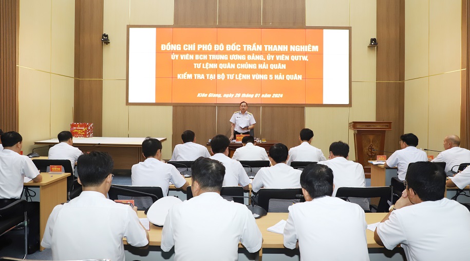 Về xây dựng nền nếp chính quy, quản lý kỷ luật, đồng chí Tư lệnh Hải quân lưu ý Vùng 5 cần tiếp tục duy trì nghiêm, không được lơ là, chủ quan, đặc biệt là tập trung xử lý các dự án đất quốc phòng thuộc Vùng 5 quản lý bảo đảm chặt chẽ, đúng thủ tục, nguyên tắc; chấp hành nghiêm các quy định về duy trì lực lượng, phương tiện trực SSCĐ; luyện tập thuần thục các phương án tác chiến trong dịp tết Nguyên đán; bảo vệ vững chắc chủ quyền biển, đảo Tây Nam của Tổ quốc và tổ chức cho bộ đội đón Tết chu đáo, an toàn, tiết kiệm...