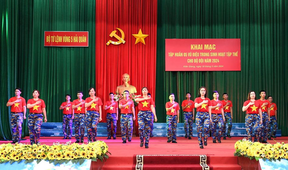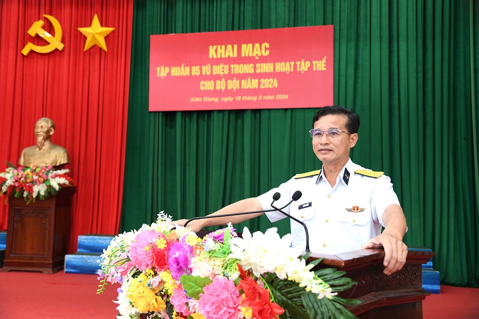 Sáng 18/3, tại TP. Phú Quốc, tỉnh Kiên Giang, Vùng 5 Hải quân tổ chức khai mạc tập huấn 5 vũ điệu trong sinh hoạt tập thể cho đội năm 2024. Đại tá Lê Văn Hưởng, Phó Chính ủy Vùng dự và chỉ đạo.