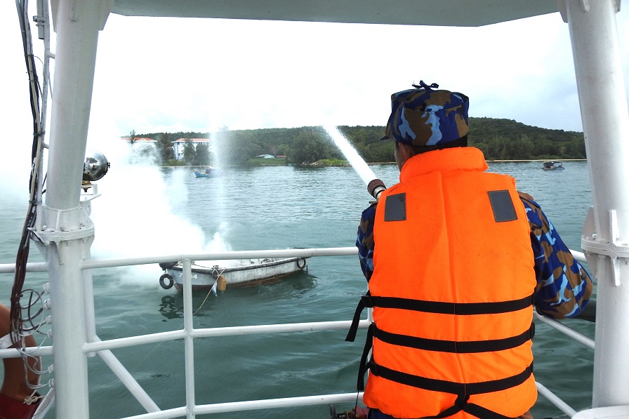 Sáng 12/11, tại TP. Phú Quốc, tỉnh Kiên Giang, Vùng 5 Hải quân tổ chức luyện tập xử trí tình huống phòng chống cháy nổ.