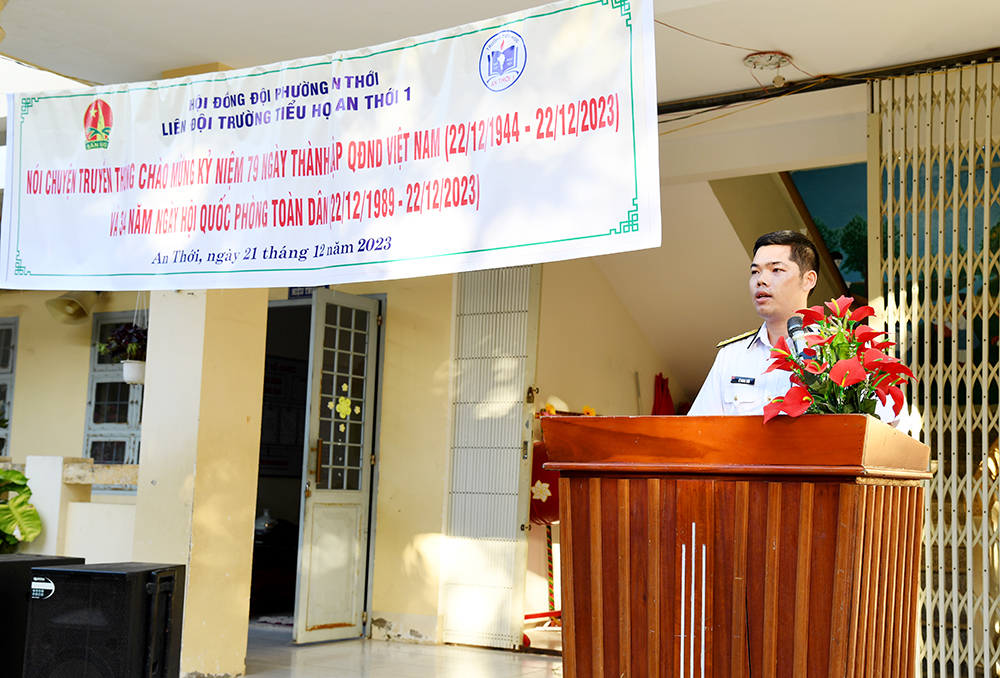 Sáng 21/12, tại TP. Phú Quốc, tỉnh Kiên Giang, Vùng 5 Hải quân phối hợp với Trường Tiểu học An Thới 1 tổ chức buổi nói chuyện truyền thống nhân dịp kỷ niệm 79 năm Ngày thành lập Quân đội nhân dân Việt Nam và 34 năm Ngày hội quốc phòng toàn dân.