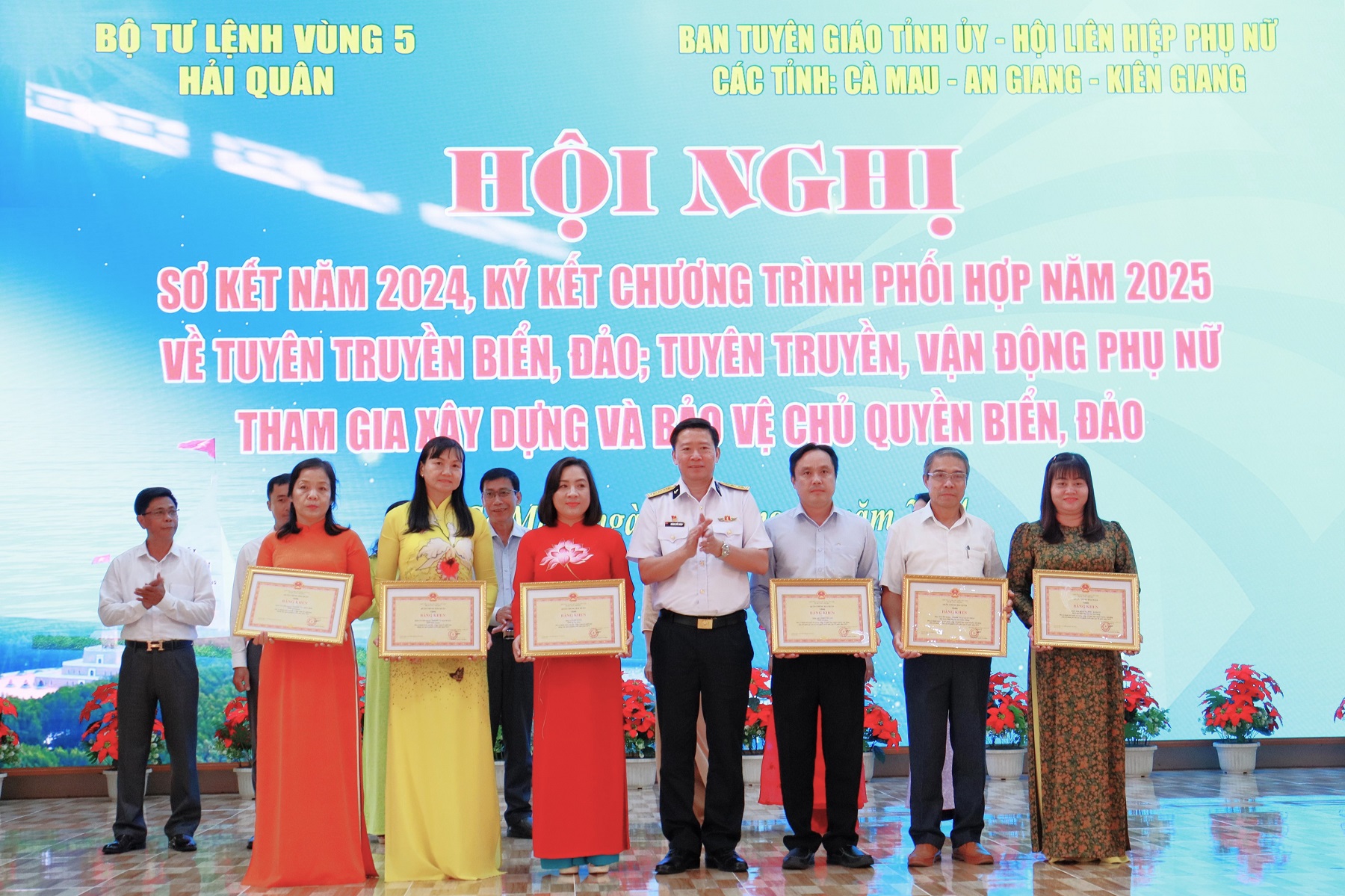 Dịp này, Bộ Tư lệnh Hải quân đã tặng Bằng khen cho 6 tập thể; Bộ Tư lệnh Vùng 5, Ban Tuyên giáo Tỉnh ủy, Hội Liên hiệp phụ nữ tỉnh Cà Mau, An Giang, Kiên Giang tặng Bằng khen, Giấy khen cho 11 tập thể và 29 cá nhân có thành tích tốt trong công tác phối hợp tuyên truyền biển đảo năm 2024.