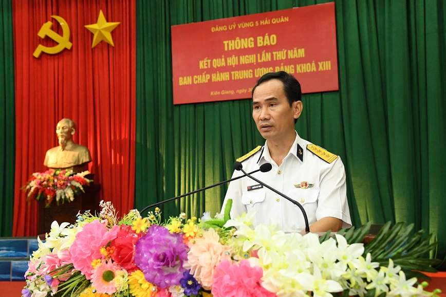 Sáng 30/5, tại TP. Phú Quốc, tỉnh Kiên Giang, Đảng uỷ Vùng 5 Hải quân tổ chức thông báo kết quả Hội nghị lần thứ 5 Ban Chấp hành Trung ương Đảng Khoá XIII cho cán bộ, đảng viên các cơ quan, đơn vị. Đại tá Nguyễn Hữu Thoan, Phó Chính ủy Vùng chủ trì.