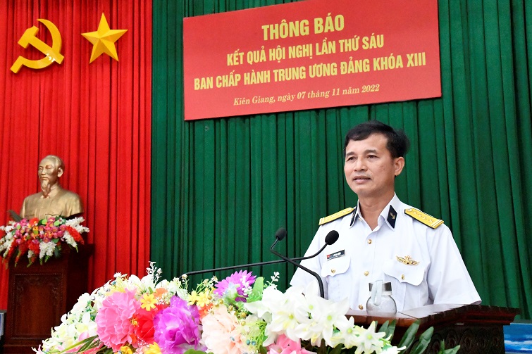 Sáng 7/11, tại TP. Phú Quốc, tỉnh Kiên Giang, Đảng ủy Vùng 5 Hải quân tổ chức thông báo kết quả Hội nghị lần thứ 6, Ban Chấp hành Trung ương Đảng Khoá XIII cho hơn 300 cán bộ, đảng viên các cơ quan, đơn vị trong Vùng. Đại tá Lê Văn Hưởng, Chủ nhiệm Chính trị Vùng chủ trì.