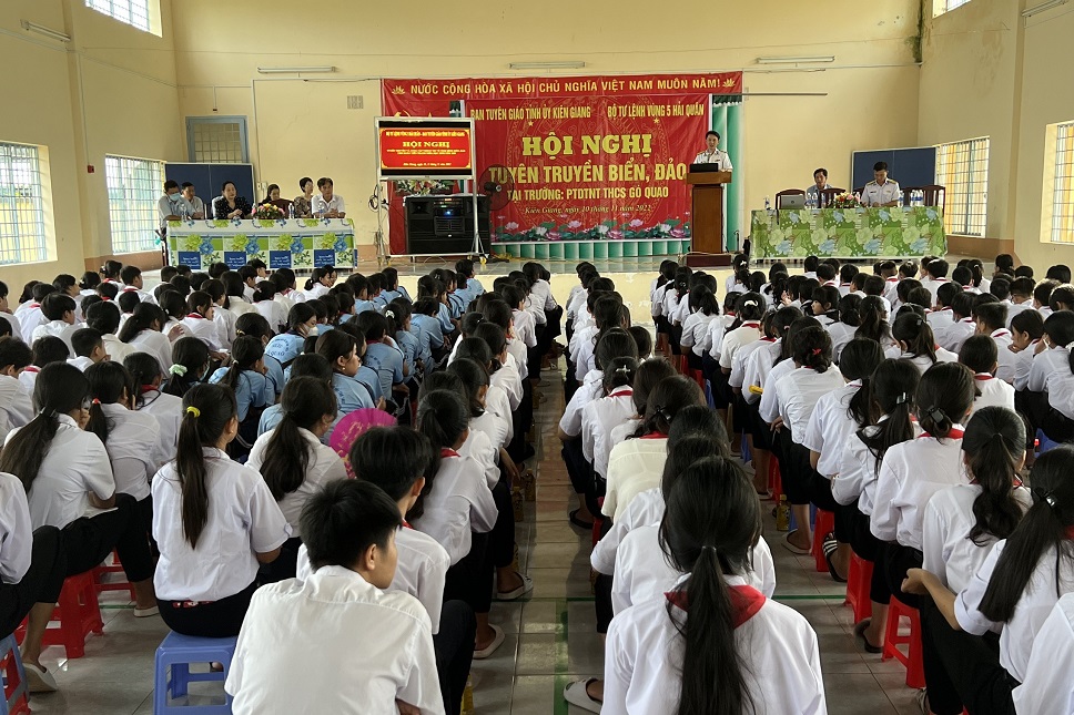 Quang cảnh buổi thông tin về biển, đảo tại Trường Phổ thông Dân tộc nội trú THCS Gò Quao