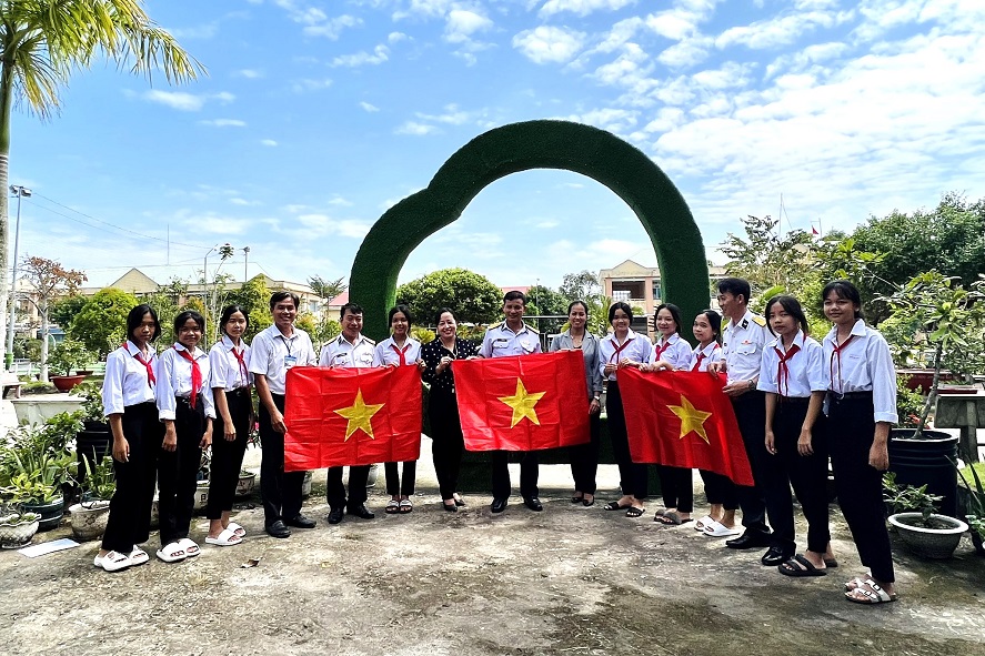 Ban tổ chức tặng cờ Tổ quốc cho thầy cô giáo và các em học sinh Trường Phổ thông Dân tộc nội trú THCS Gò Quao