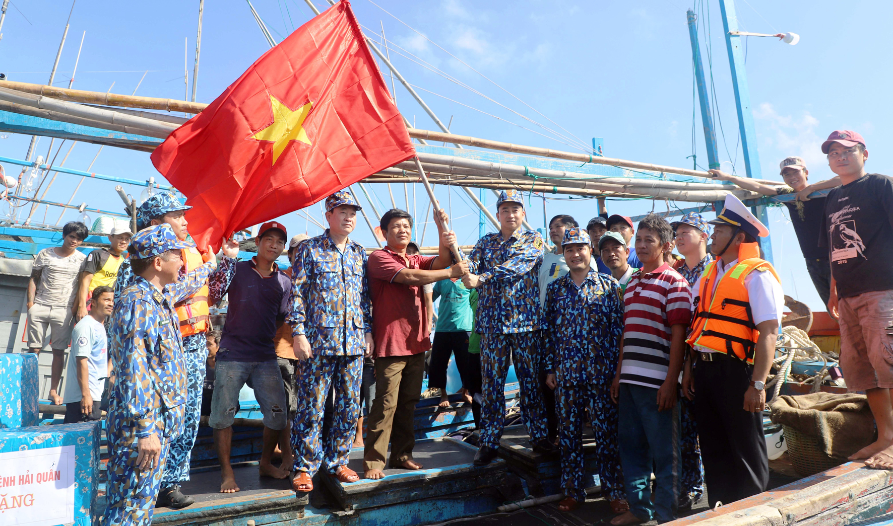 Chuẩn Đô đốc Trần Thanh Nghiêm và đoàn công tác tặng cờ Tổ quốc cho ngư dân ở Trường Sa. Ảnh: Đức Tuấn