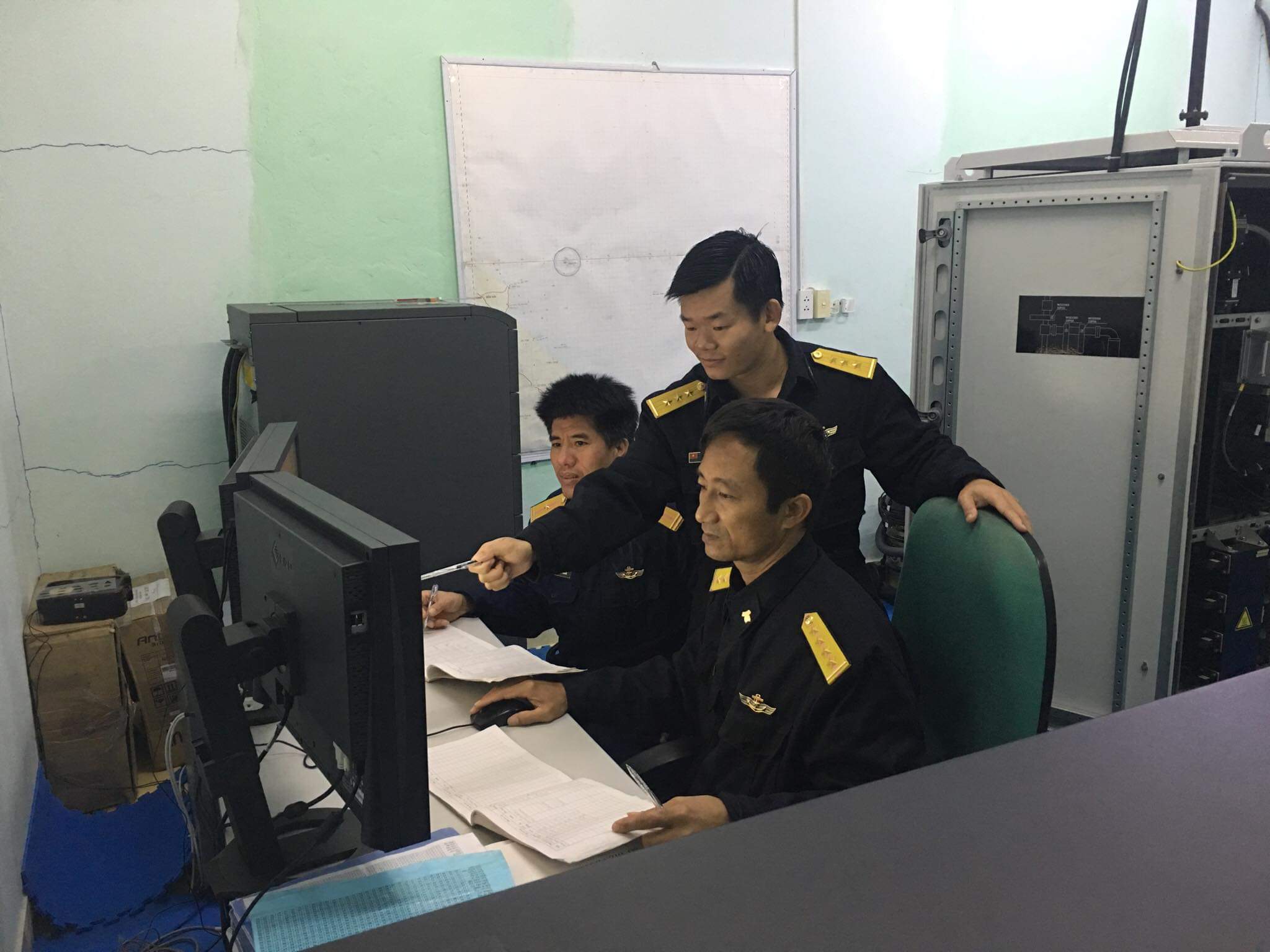 Bước vào trong phòng máy ra đa đúng lúc kíp trực đang làm việc, chúng tôi cũng căng mắt theo dõi từng chuyển động trên màn hình ra đa. Các thông số như cự ly, số lượng, chủng loại của các phương tiện hoạt động trên biển được kíp trực thể hiện chi tiết trên bản đồ, sau đó toàn bộ các mục tiêu được thông báo đầy đủ về trung tâm xử lý.