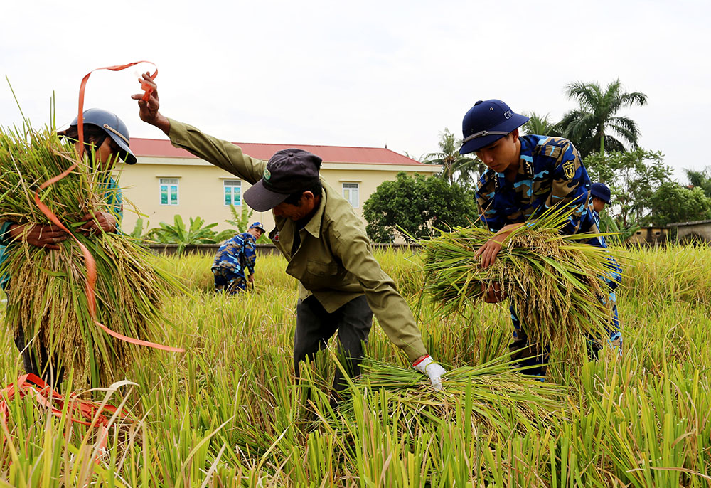 Chiến sĩ Lữ đoàn 679, Vùng 1 giúp dân xã An Thắng, huyện An Lão, TP Hải Phòng thu hoạch lúa. Ảnh: PV