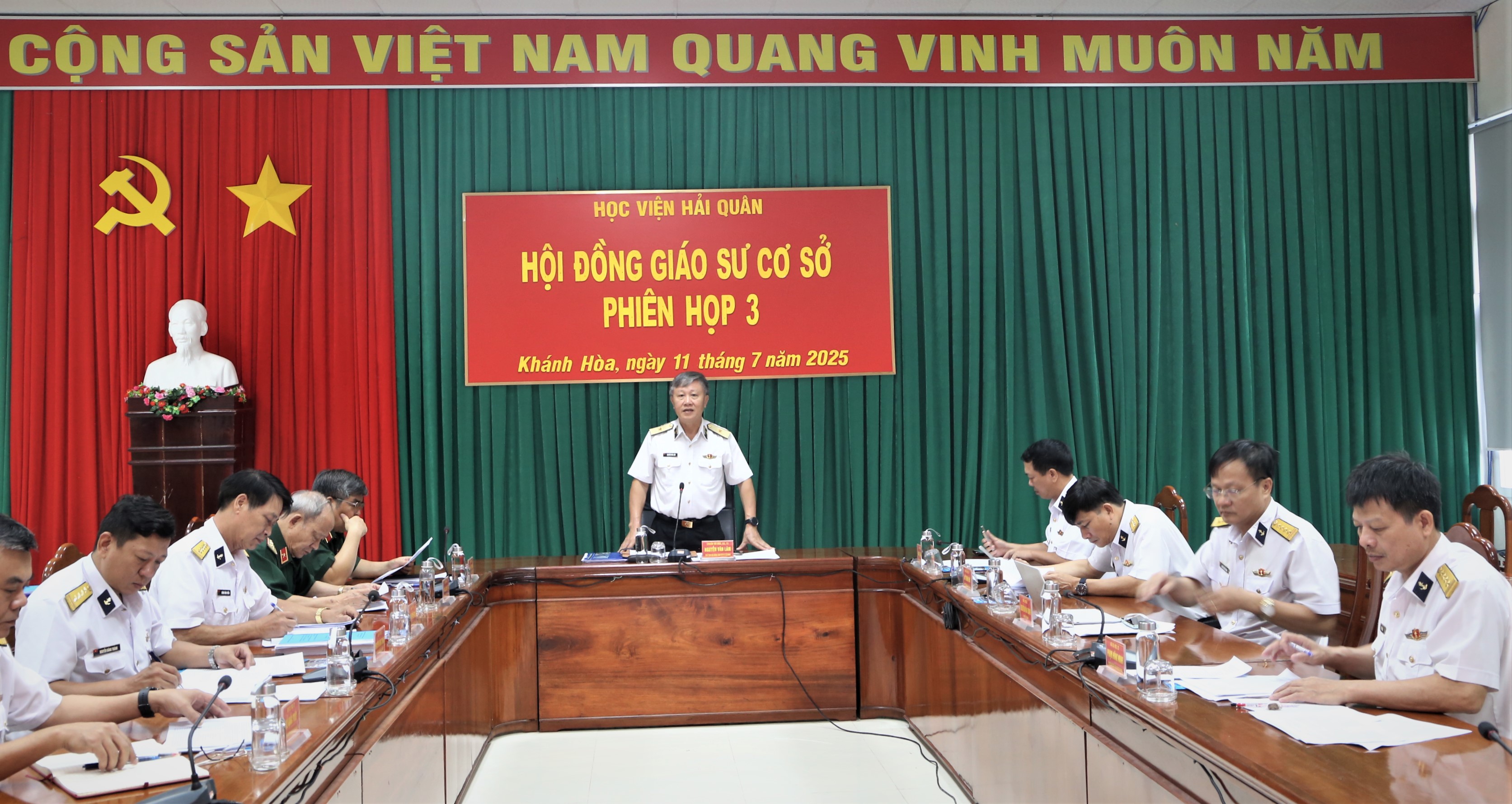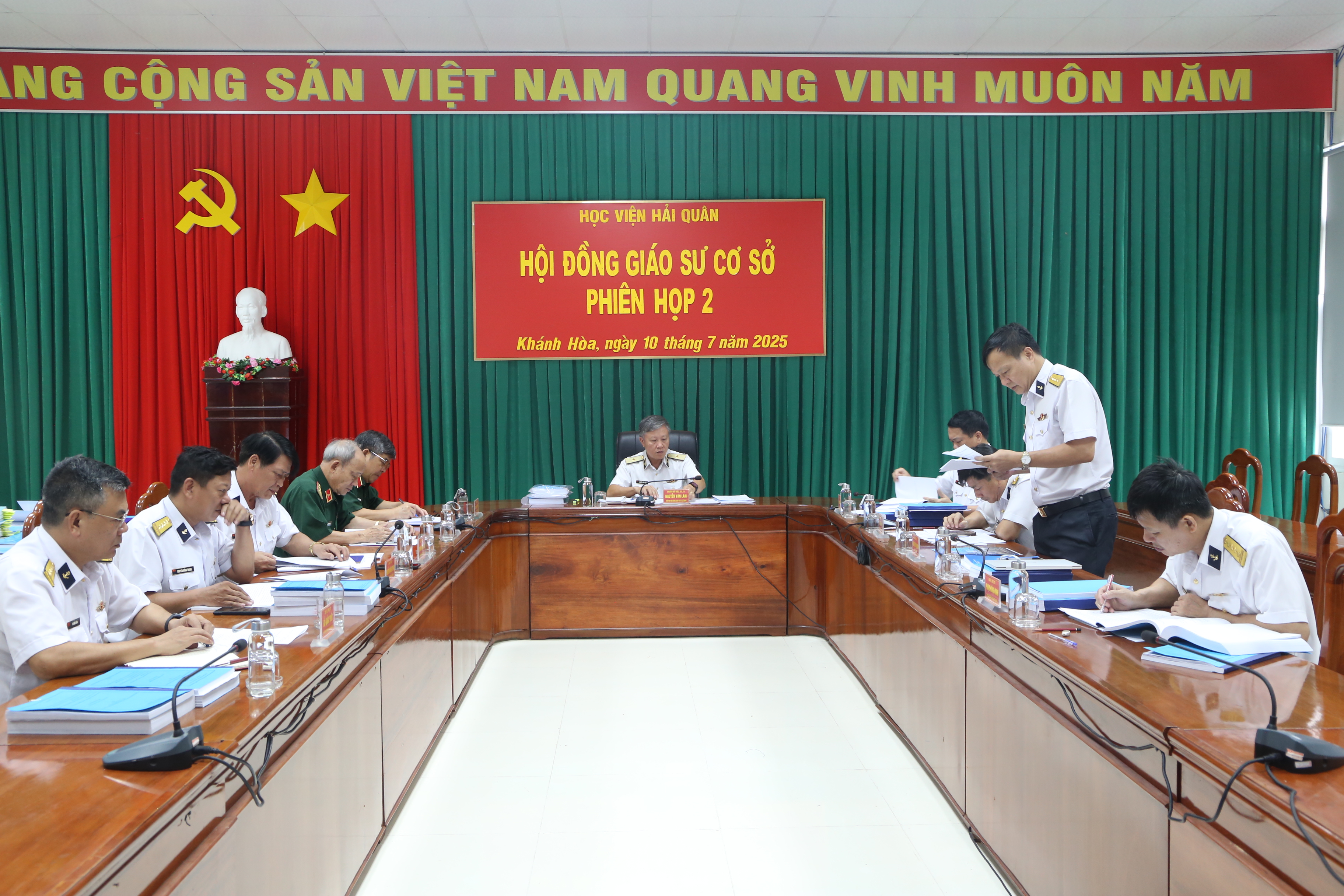 Ngày 10 và 11/7, Hội đồng Giáo sư cơ sở Học viện Hải quân tổ chức 2 phiên họp xét, đề nghị công nhận đạt tiêu chuẩn chức danh phó giáo sư năm 2025. Chuẩn Đô đốc, GS.TS Nguyễn Văn Lâm, Chủ tịch Hội đồng Giáo sư cơ sở Học viện Hải quân chủ trì các phiên họp.