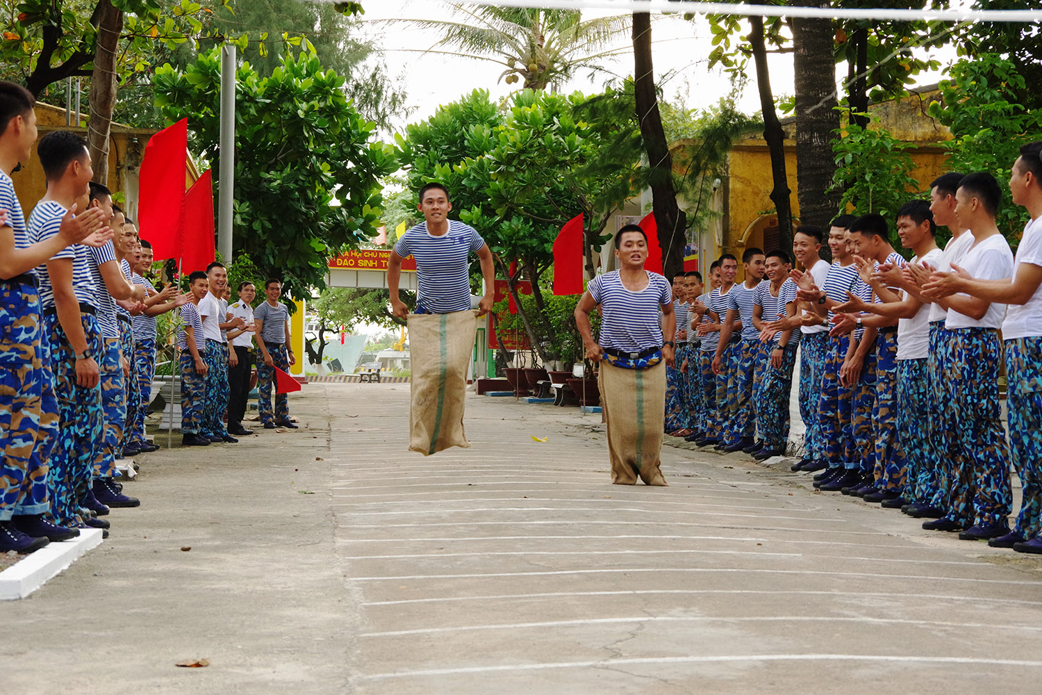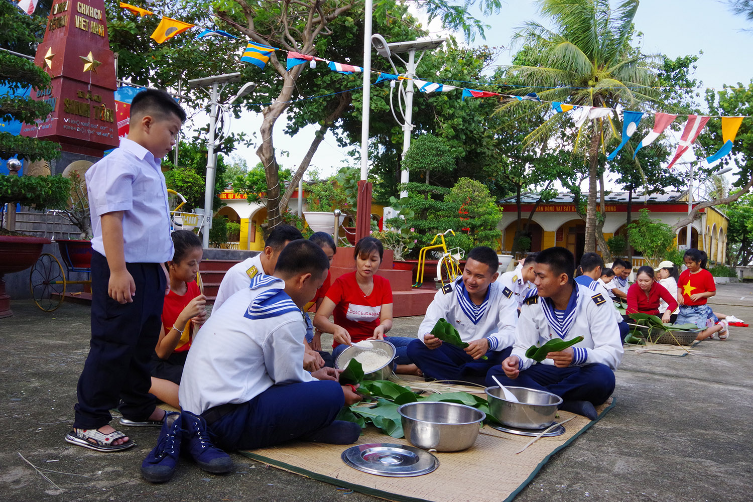 Quân và dân trên đảo Sinh Tồn gói bánh chưng tết