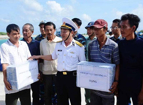 Ngư dân xã đảo Song Tử Tây vui mừng nhận quà Tết của bộ đội trao tặng.