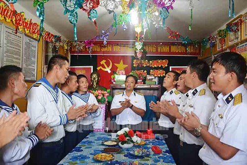 Sáng đầu xuân, quân và dân xã đảo Sinh Tồn tập trung đông đủ chúc Tết đất liền “năm mới thắng lợi mới”.