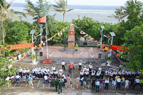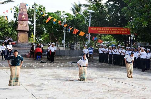 Trò chơi dân gian “Nhảy bao bố” thu hút đông đảo cán bộ, chiến sĩ đảo Nam Yết vui chơi ngày Tết.