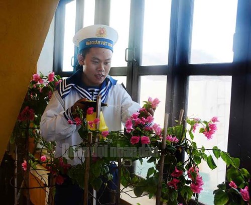 Chiến sĩ đảo Đá Nam chăm sóc chậu hoa cho đảo nhỏ thêm xuân.
